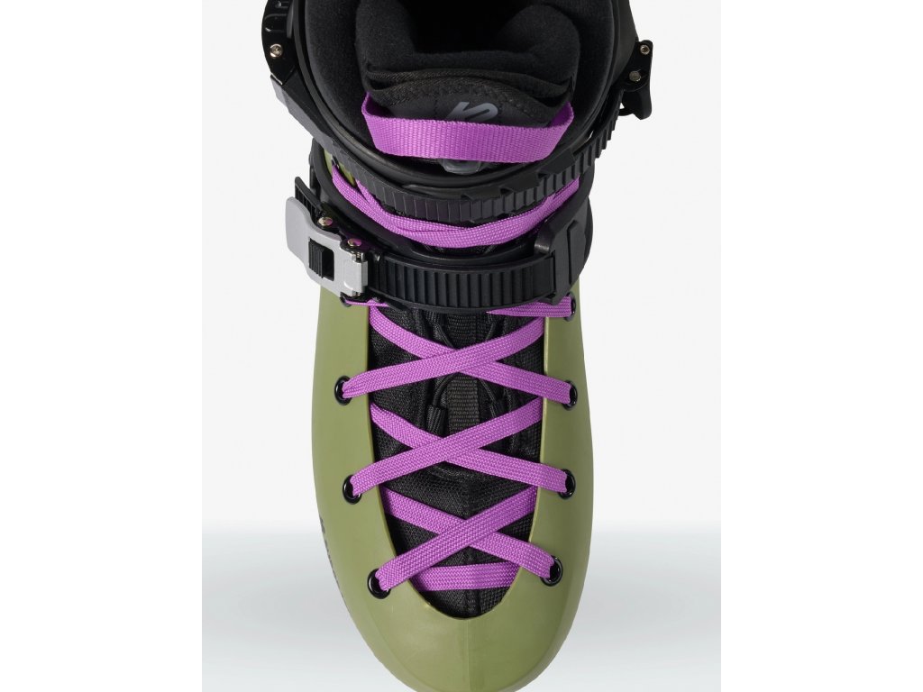 Zapínání na přezky - horní přezka se postará o zpevnění kotníku, spodní páková přezka zabraňuje zvedání paty, čímž zlepšuje usazení nohy v brusli. Obě přezky jsou hliníkové, čímž je zvýšena jejich odolnost.