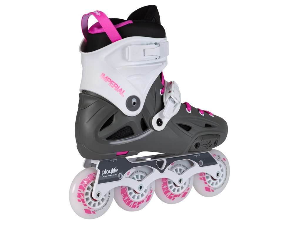 Kolečkové brusle Playlife Imperial 80 Fuchsia představují osvědčenou freeskate klasiku pro jízdu ve městě, slalom či stezku. Jde o levnější variantu díky použití základních komponentů (vnitřní bota, kolečka, přezky). Brusle jsou osazeny spolehlivým hliníkovým rámem o délce 243 mm se čtyřmi základními kolečky Playlife 80 mm / 85A a ložisky WCD Abec 9. Jedná se o nejklasičtější velikost koleček v kategorii slalom/freeskate. Brusle si tak zachovávají velmi nízké těžiště i skvělou ovladatelnost. Jízda přes horší povrch s nimi však není tak komfortní jako s kolečky o větším průměru.