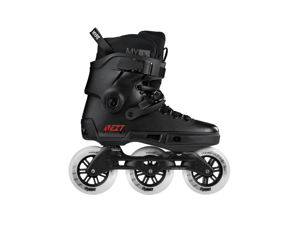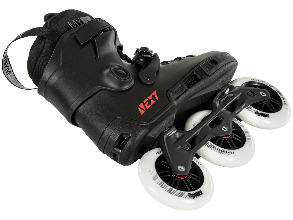 Brusle, které píší novou kapitolu bruslení jsou tady! Kolečkové brusle Powerslide Next přináší na trh úplně novou botu s několika naprostými novinkami. Více než 2 roky dlouhý vývoj se skutečně vyplatil. Řada Next je ve své kategorii na současném trhu bezkonkurenčně nejlepší. Tento model je osazen pevným litým rámem z hliníku, kolečky Powerslide Spinner o průměru 100mm a tvrdosti 88a s ložisky WCD Freespin Abec 9. Jedná se o nejmenší velikost koleček z kategorie triskate. Brusle si tak zachovávají velmi nízké těžiště i skvělou ovladatelnost. Jízda přes horší povrch s nimi však není tak komfortní jako s kolečky o větším průměru. Skelet brusle je již klasicky vyroben s přídavkem sklolaminátu, který dodává bruslím vyšší pevnost a zachovává nízkou hmotnost. V přední, boční i zadní části boty jsou nově přidány otvory pro odvětrávání. Klasický malý boční slide protector nahradil větší a praktičtější 270° chránič po celém obvodu špičky brusle. Uchycen je dvěma šroubky a v případě potřeby ho vyměníte během pár vteřin. Vnitřní část skeletu je nad kotníkem předpřipravena pro doladění tuhosti boty přímo dle potřeb majitele. Výstupky mají na sobě značky pro seříznutí, čímž jde docílit měkčí brusle v oblasti kotníku. Revolucí prošlo i uchycení cuffu (kloubu v oblasti kotníku). Díky asymetrickým vložkám se závitem lze cuff z obou stran umístit do dvou různých výšek a to i nezávisle na výšce uchycení na druhé straně brusle. Tyto možnosti mohu pomoci proti propadávání kotníku atd. Pod patou umístěný shock absorber (gumová stélka) pomáhá jezdci tlumit každý dopad. Jak je již u Powerslidu zvykem, vnitřní botička (liner) je nejvyšší možné kvality. Její špička je z pružného neoprénu a přizpůsobí se noze jako ponožka. Anatomicky tvarovaná výstelka je vyrobena z paměťové pěny, která reaguje na zvýšenou lidskou teplotu při sportu a dotvaruje se přímo na nohu majitele. Očka pro zavazování jsou nově vedena až pod horní přezku a díky možnosti provléknutí tkaniček i skrz očka lineru vzniká několik různých možností zavázání bruslí. Páková přezka přes nárt a klasická nad kotníkem dotváří 100% spolehlivý systém zapínání bruslí. Skvělý a revoluční systém Trinity je zde úplně poprvé použit na skeletové brusli. Rám je uchycen místo dvěma klasickými rovnou, třemi šrouby (jeden pod patou, dva pod špičkou). To umožňuje maximální přiblížení koleček k botě, snížení těžiště a zvýšení stability. Navíc tento systém spolehlivěji tlumí vibrace vyvolané jízdou, lépe přenáší sílu odrazu a poskytuje více kontroly nad jízdou samotnou. Uchycení umožňuje i částečný posun rámu do všech 4 stran a tím možné doladění přímo dle svých potřeb. Osy kol se z jedné strany šroubují přímo do těla rámu. Servis bruslí je tak extrémně jednoduchý, rychlý a stačí k němu jeden klíč. Brusle je možné osadit klasickou nastavitelnou Powerslide HABS brzdou, která však není součástí balení. Moderní a čistý design Nextů za svou krásou schovává hned několik revolučních novinek, které nenajdete nikde jinde. Obujte i vy skutečně jedinečné brusle. (Pro výběr správné velikosti použijte tabulku velikostí, která je umístěna mezi obrázky produktu.)