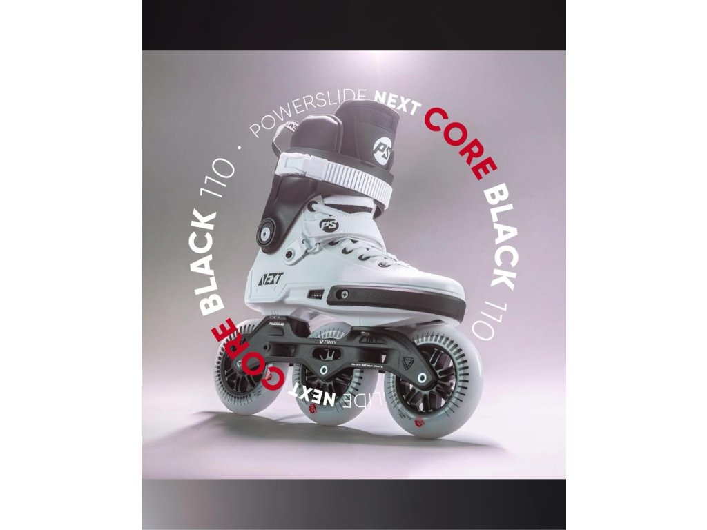 Tříkolečkové brusle Powerslide Next Core 110 Trinity pro rok 2024. Tento nový černobílý model představuje pokračování celosvětově oblíbené řady Next, kterou si uživatelé oblíbili nejen pro své technické kvality, ale i vysokou všestrannost.