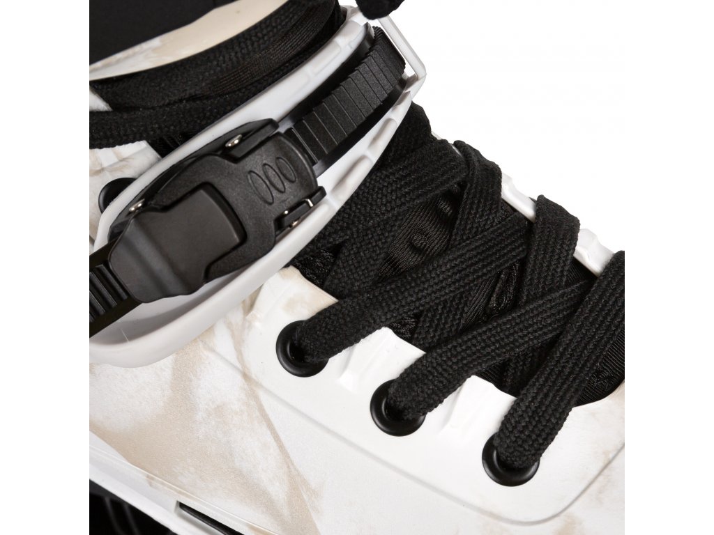 Co kus, to originál! Brusle Powerslide Next Marble White 110 mají díky nové technologii míchání barev pokaždé trochu jiné mramorování skeletu. Technickým vylepšením je Myfit Reaction liner a nový tvar přezky přes nárt pro jednoduší ovládání. Tento model je osazen pevným litým rámem z hliníku o délce 335mm, kvalitními kolečky Powerslide Spinner o průměru 110mm s tvrdostí 88a a ložisky WCD Freespin Abec 9. Takto dlouhý rám je velmi stabilní, lépe vede nohu při bruslení a dovoluje využít větší sílu při odrazu. Zároveň je však s ním brusle hůře ovladatelná na malém prostoru. Skelet brusle je již klasicky vyroben s přídavkem sklolaminátu, který dodává bruslím vyšší pevnost a zachovává nízkou hmotnost. V přední, boční i zadní části boty jsou nově přidány otvory pro odvětrávání. Klasický malý boční slide protector nahradil větší a praktičtější 270° chránič po celém obvodu špičky brusle. Uchycen je dvěma šroubky a v případě potřeby ho vyměníte během pár vteřin. Vnitřní část skeletu je nad kotníkem předpřipravena pro doladění tuhosti boty přímo dle potřeb majitele. Výstupky mají na sobě značky pro seříznutí, čímž jde docílit měkčí brusle v oblasti kotníku. Revolucí prošlo i uchycení cuffu (kloubu v oblasti kotníku). Díky asymetrickým vložkám se závitem lze cuff z obou stran umístit do dvou různých výšek a to i nezávisle na výšce uchycení na druhé straně brusle. Tyto možnosti mohu pomoci proti propadávání kotníku atd. Pod patou umístěný shock absorber (gumová stélka) pomáhá jezdci tlumit každý dopad. Jak je již u Powerslidu zvykem, vnitřní botička (liner) je nejvyšší možné kvality. Její špička je z pružného neoprénu a přizpůsobí se noze jako ponožka. Jazyk je vyroben ze speciální 3DAP pěny. Anatomicky tvarovaná výstelka je vyrobena z paměťové pěny, která reaguje na zvýšenou lidskou teplotu při sportu a dotvaruje se přímo na nohu majitele. Očka pro zavazování jsou nově vedena až pod horní přezku a díky možnosti provléknutí tkaniček i skrz očka lineru vzniká několik různých možností zavázání bruslí. Páková přezka přes nárt a klasická nad kotníkem dotváří 100% spolehlivý systém zapínání bruslí. Skvělý a revoluční systém Trinity je zde úplně poprvé použit na skeletové brusli. Rám je uchycen místo dvěma klasickými rovnou, třemi šrouby (jeden pod patou, dva pod špičkou). To umožňuje maximální přiblížení koleček k botě, snížení těžiště a zvýšení stability. Navíc tento systém spolehlivěji tlumí vibrace vyvolané jízdou, lépe přenáší sílu odrazu a poskytuje více kontroly nad jízdou samotnou. Uchycení umožňuje i částečný posun rámu do všech 4 stran a tím možné doladění přímo dle svých potřeb. Osy kol se z jedné strany šroubují přímo do těla rámu. Servis bruslí je tak extrémně jednoduchý, rychlý a stačí k němu jeden klíč. Brusle je možné osadit klasickou nastavitelnou Powerslide HABS brzdou, která však není součástí balení. Jedinečný dvoubarevný vzhled modelu Powerslide Next Marble White 110 za svou krásou schovává hned několik revolučních novinek, které nenajdete nikde jinde. Obujte i vy skutečně jedinečné brusle. (Pro výběr správné velikosti použijte tabulku velikostí, která je umístěna mezi obrázky produktu.)