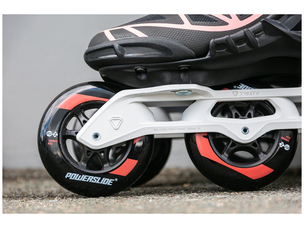 Trinity znamená, že rám je uchycen místo dvěma klasickými, rovnou třemi šrouby. Toto revoluční řešení umožňuje maximální přiblížení koleček k botě, snížení těžiště a zvýšení stability. Navíc tento systém spolehlivěji tlumí vibrace vyvolané jízdou, lépe přenáší sílu odrazu a poskytuje více kontroly nad jízdou samotnou. Uchycení umožňuje i částečný posun rámu do všech 4 stran a tím možné doladění přímo dle svých potřeb.