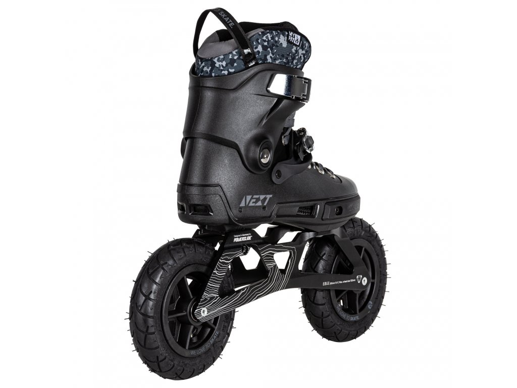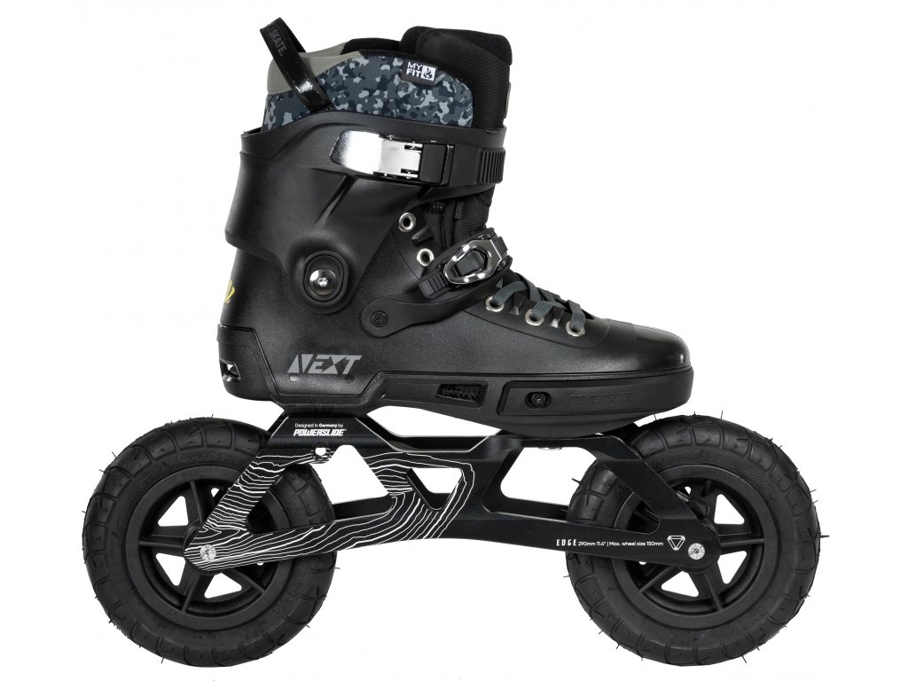 Osazeno extrémně pevným hliníkovým Trinity rámem vyrobeným na CNC z jednoho kusu. Kola Powerslide CST Pro air 150mm s ložisky WCD Rustproof, která jsou navržena speciálně pro použití v mokru. Použití pouze dvou velkých koleček výrazně snižuje celkovou hmotnost brusle a krátký rám (290mm) tohoto modelu dělá off-road bruslení nejpodobnější tomu klasickému. Next Edge 150 se tak hodí především pro cesty s nezpevněným povrchem, lesní stezky atd.