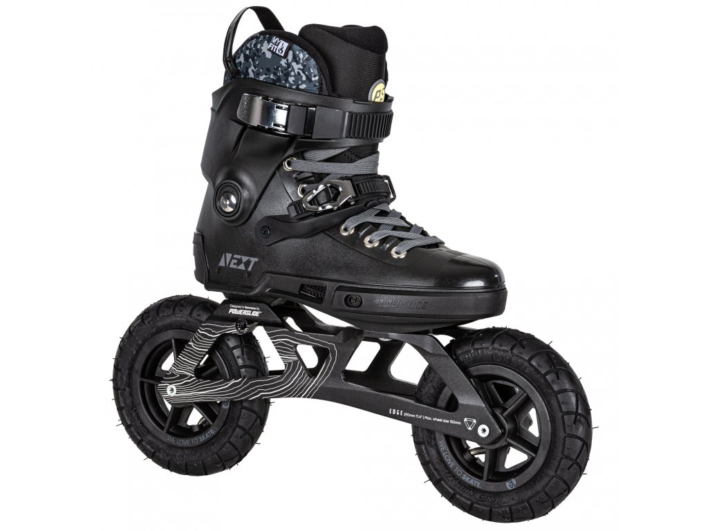 Osazeno extrémně pevným hliníkovým Trinity rámem vyrobeným na CNC z jednoho kusu. Kola Powerslide CST Pro air 150mm s ložisky WCD Rustproof, která jsou navržena speciálně pro použití v mokru. Použití pouze dvou velkých koleček výrazně snižuje celkovou hmotnost brusle a krátký rám (290mm) tohoto modelu dělá off-road bruslení nejpodobnější tomu klasickému. Next Edge 150 se tak hodí především pro cesty s nezpevněným povrchem, lesní stezky atd.