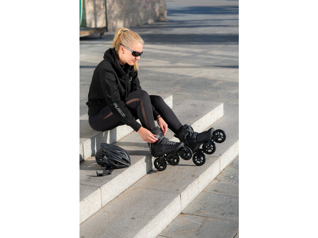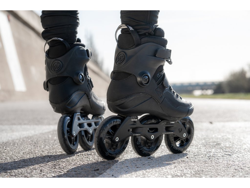 Celočerné tříkolečkové brusle Powerslide Swell Triple Black 110 Trinity. Tento model je osazen lehkým litým rámem z hliníku, kvalitními kolečky Swell Infinity o průměru 110mm a tvrdosti 86a s ložisky WCD Freespin Abec 9. Jedná se o střední velikost koleček z kategorie triskate. Brusle si tak zachovávají nízké těžiště i dobrou ovladatelnost. Nové Trinity X, které umožňuje posun rámu do všech 4 stran ve větším rozsahu než dříve. Dále úpravou prošla celá vrchní část brusle včetně cuffu, který nyní po utažení lépe obepíná nohu a poskytuje tak více opory. Řada Swell vznikla na základě technologie elitních závodních bruslí a je díky svým vysokým kvalitám vhodná i pro nejnáročnější kondiční bruslaře. Zabudovaná vnitřní botička je pevnou součástí brusle a dodává bruslím schopnost perfektní odezvy na jakýkoliv provedený pohyb. Díky kvalitní paměťové pěně jsou brusle pohodlné již od prvního obutí. Pěna navíc reaguje na zahřívání těla při sportu a v průběhu používání se dotvarovává přímo na nohu majitele. Zároveň je i samotný skelet brusle částečně tepelně tvarovatelný. Měkká vrchní část brusle je vyrobena z pevného a zároveň dobře prodyšného materiálu. Vysoce odolný materiál na špičce a boku chrání brusli před odřením při pádech a prodlužuje tak její životnost. Zavazování pomocí plochých voskovaných tkaniček, klasické přezky nad kotníkem a pásku na suchý zip přes nárt drží nohu spolehlivě na svém místě. Anatomicky tvarovaná skořepina ze speciálního kompozitního materiálu s přídavkem sklolaminátu je lehká, pevná a poskytuje vyšší stupeň opory než běžně používaný plast. Trinity rám je uchycen místo dvěma klasickými, rovnou třemi šrouby (jeden pod patou, dva pod špičkou). Toto revoluční řešení umožňuje maximální přiblížení koleček k botě, snížení těžiště a zvýšení stability. Navíc tento systém spolehlivěji tlumí vibrace vyvolané jízdou, lépe přenáší sílu odrazu a poskytuje více kontroly nad jízdou samotnou. Uchycení umožňuje i částečný posun rámu do všech 4 stran a tím možné doladění přímo dle svých potřeb. Osy kol se z jedné strany šroubují přímo do těla rámu. Servis bruslí je tak extrémně jednoduchý, rychlý a stačí k němu jeden klíč. Posuvný špalek brzdy umožňuje nastavení libovolného úhlu k brzdění, zároveň vydrží díky možnému pohybu delší dobu než u jiných značek bruslí. Powerslide Swell Triple Black jsou spolehlivé, lehké a velmi komfortní brusle, které zlepší vaši výkonnost a poskytnou úplně nový prožitek z bruslení. Nechte se o jejich kvalitách přesvědčit již při první vyjížďce. (Pro výběr správné velikosti použijte tabulku velikostí, která je umístěna mezi obrázky produktu.)
