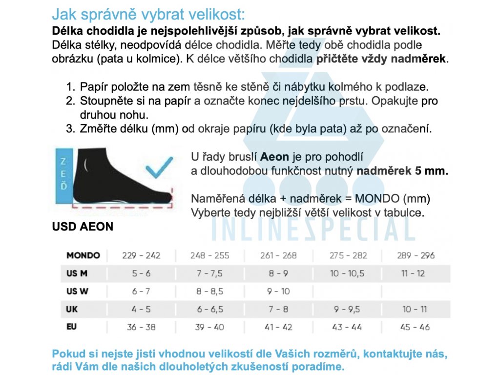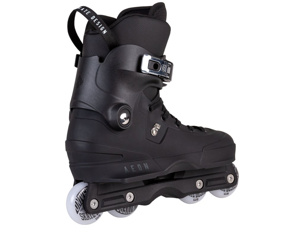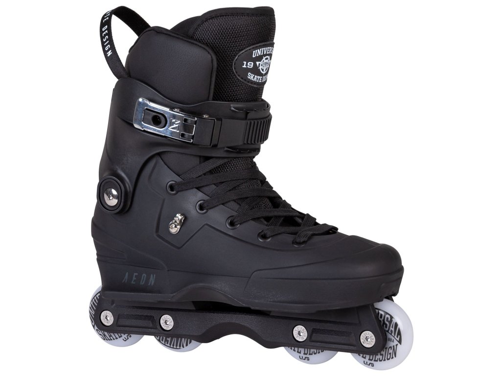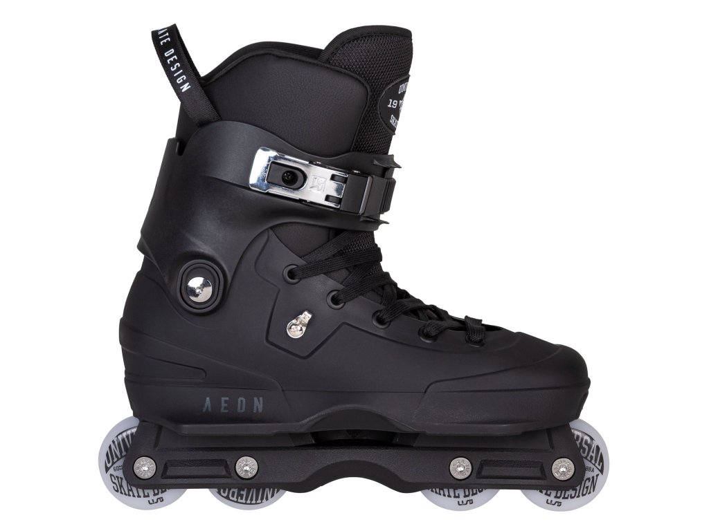 Aggressive brusle USD Aeon 60 Black v klasické celočerné kombinaci. Nová nízkoprofilová Kizer Supreme přezka, tvar cuffu a systém jeho uchycení. Ten je nyní možné nastavit do dvou různých výšek a regulovat tak oporu v kotníku dle vlastní potřeby. Dále již zůstává vše stejné a skvělé jak jsme u Aeonů zvyklý. Řada Aeon přišla na trh v roce 2015 a nabídla něco, co momentálně žádné jiné aggressive brusle na trhu nemají. Tím trumfem je jedinečná jednodílná konstrukce - shell, soulplate a frame je dohromady jeden díl. Brusle jsou díky tomu extrémně lehké, mají velmi nízké těžiště (vysokou stabilitu) a výborný přenos síly z každého odrazu. Skelet je tvarově velmi dobře navržen a poskytuje dostatek místa i širšímu tvaru chodidla. Soulplate tvořící jeho vnější boční část je z obou stran příjemně široký a dobře navazuje na zabudovaný frame. O pohodlí uvnitř brusle se stará spolehlivý USD Basic liner. Zavazování je řešeno tkaničkami a přezkou. Celý tento koncept je navržen speciálně pro používání všech koleček o stejné velikosti (flat). Prostřední kolečka jsou posunuta více od středu (to je možné díky absenci UFS uchycení framu). H-blok je tak dostatečně široký a kvalitně kryje prostřední kolečka proti jejich nechtěným zásekům při grindech. Brusle je osazena kolečky USD Team 60mm/88a s ložisky WCD ABEC 9. Celá řada Aeon je již roky prověřená a těší se nejen u nás, ale i ve světě velké oblibě. Výběrem tohoto modelu tak jistě nešlápneš vedle. (Pro výběr správné velikosti použijte tabulku velikostí, která je umístěna mezi obrázky produktu.)