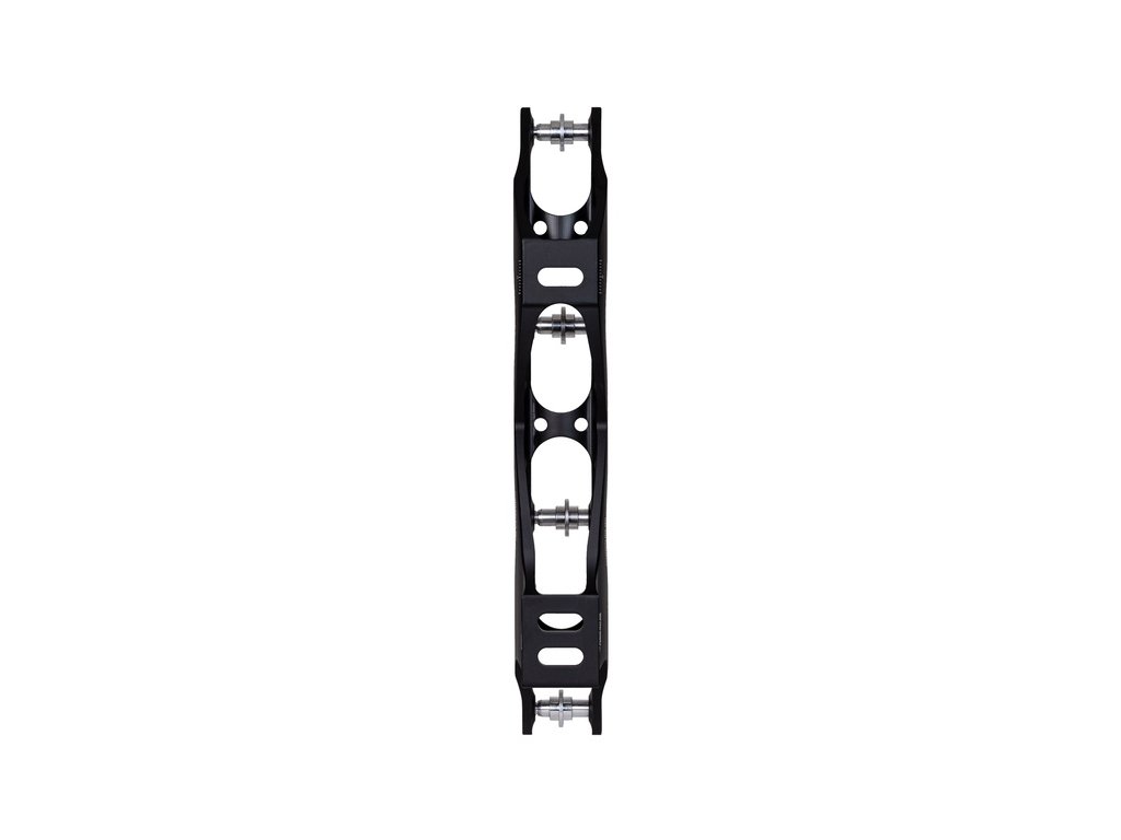 Rám je extrudovaný a CNC obráběný pro optimální tuhost a stabilitu. Double-void konstrukce poskytuje perfektní rovnováhu mezi nízkou hmotností a odolností při vysokých rychlostech. Integrované spacery zajišťují přesné vedení koleček a hladký odraz.