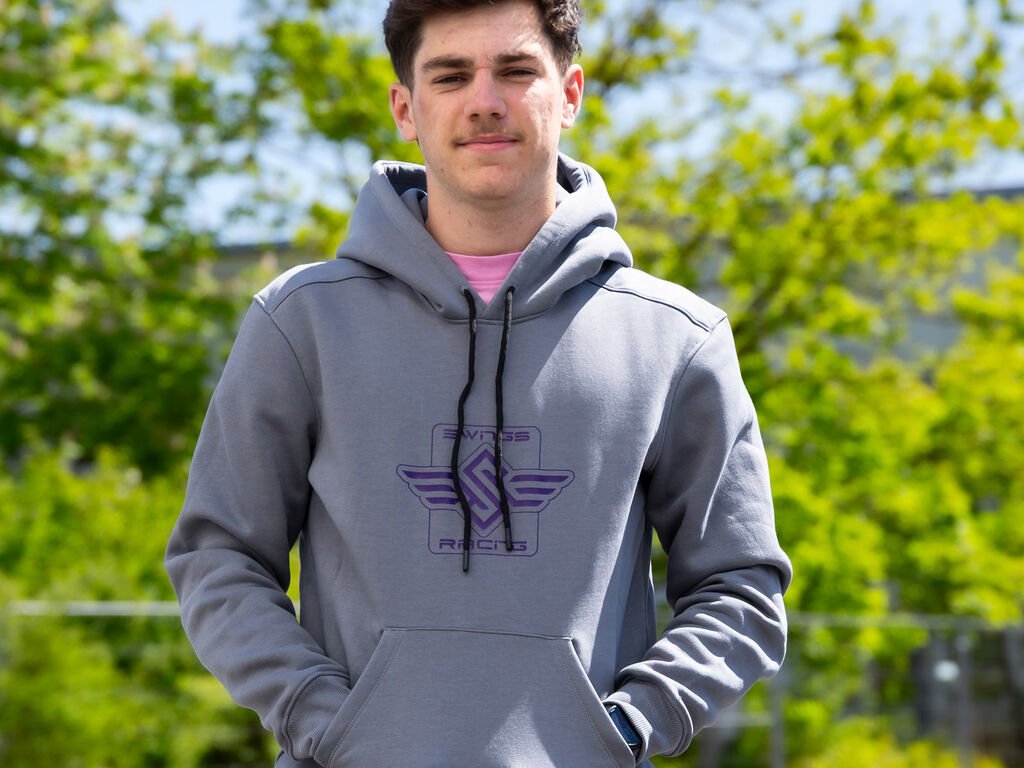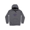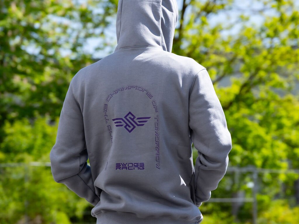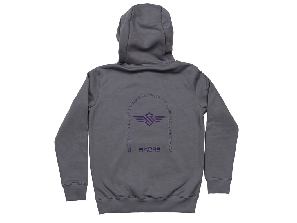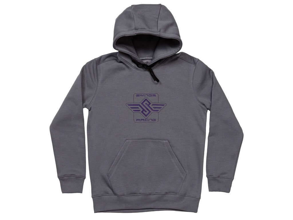 Šedá mikina s kapucí Swings. Fialový potisk na prsou i zádech. Materiál: 100% bavlna.