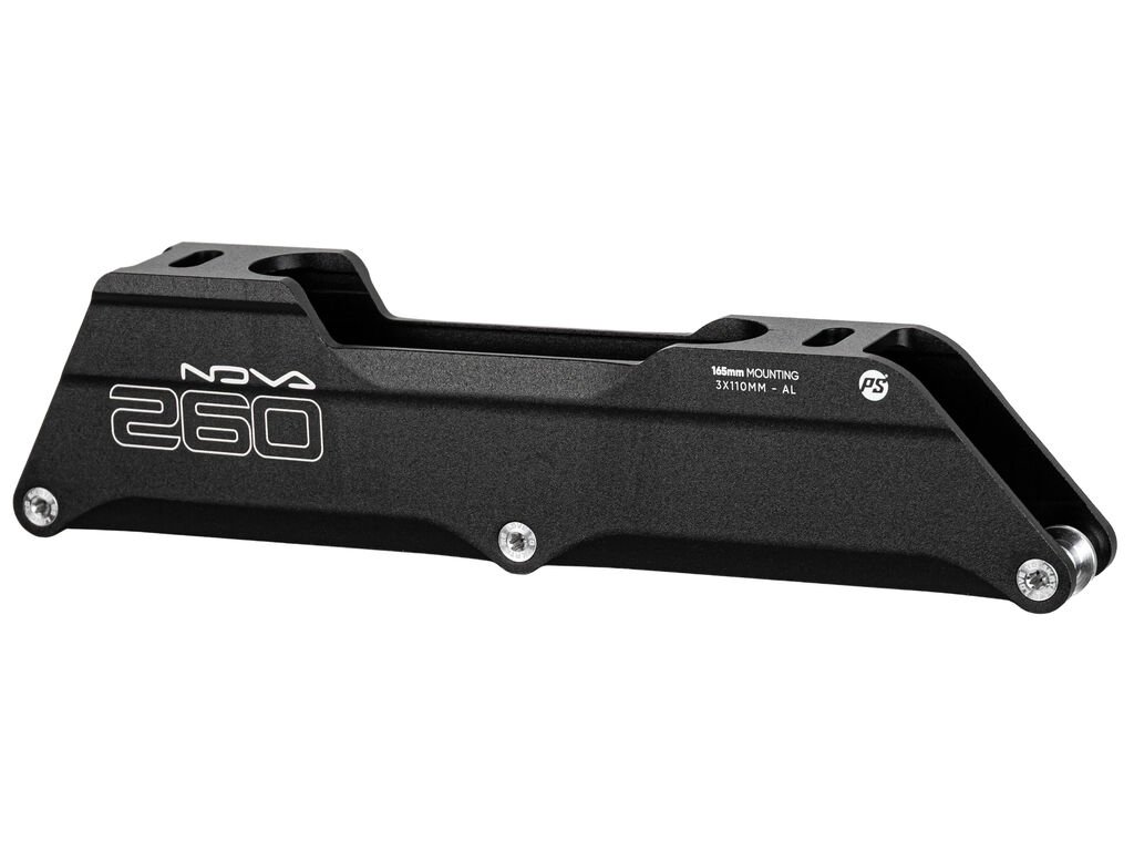Černý tříkolečkový hliníkový rám (Frame) Powerslide Nova (3x110mm 260mm). Rám je vyráběn na CNC z jednoho kusu hliníku, díky čemuž je nejen lehký, ale také velmi pevný a odolný.