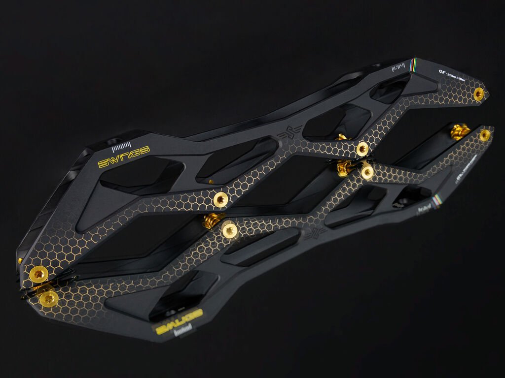 Díky extruzi a CNC obrábění je rám dokonale přesný a esteticky propracovaný, s laserově tištěným designem. Široká plocha uchycení boty zajišťuje efektivní přenos síly, zatímco přímé boční stěny umožňují maximálně účinný odraz. Aerodynamický tvar rámu zaručuje nízký profil, lehkost a vysokou tuhost.
