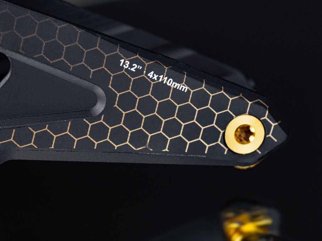Délka rámu 13.2" / 335 mm a konfigurace 4x110 mm poskytují vynikající stabilitu i při vysokých rychlostech. Díky spolehlivé rozteči uchycení 195 mm je rám kompatibilní s většinou závodních bot. Integrované CNC obráběné rozpěrky a precizní vedení os zajišťují dokonalou přesnost a tuhost rámu.